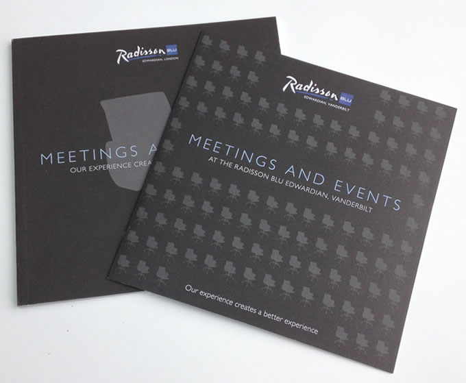 Brochures, invitations, charity event cards, posters, restaurant and bar menus and in-room T.V screen displays.